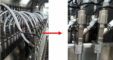 4、氣缸帶動(dòng)灌裝頭運(yùn)行的下潛灌裝方式,配合可設(shè)定的變速灌裝功能,可降低易起泡物料在灌裝時(shí)泡沫的產(chǎn)生,防止物料外溢造成的瓶口污染。同時(shí)將灌裝頭下潛的氣缸動(dòng)作機(jī)構(gòu)移到積液水盤的下方,防止外濺物料對氣缸等零件的腐蝕,目前只有我公司采用這種專li機(jī)構(gòu)。